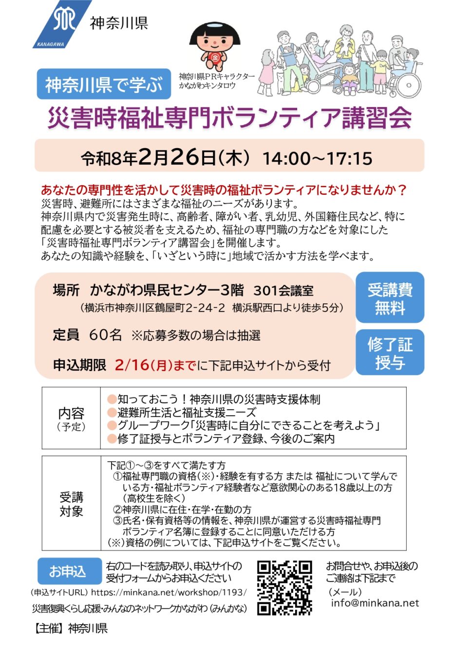 災害時、避難所にはさまざまな福祉のニーズがあります。神奈川県内で災害発生時に、高齢者、障がい者、乳幼児、外国籍住民など、特に配慮を必要とする被災者を支えるため、福祉の専門職の方などを対象にした「災害時福祉専門ボランティア講習会」を開催します。